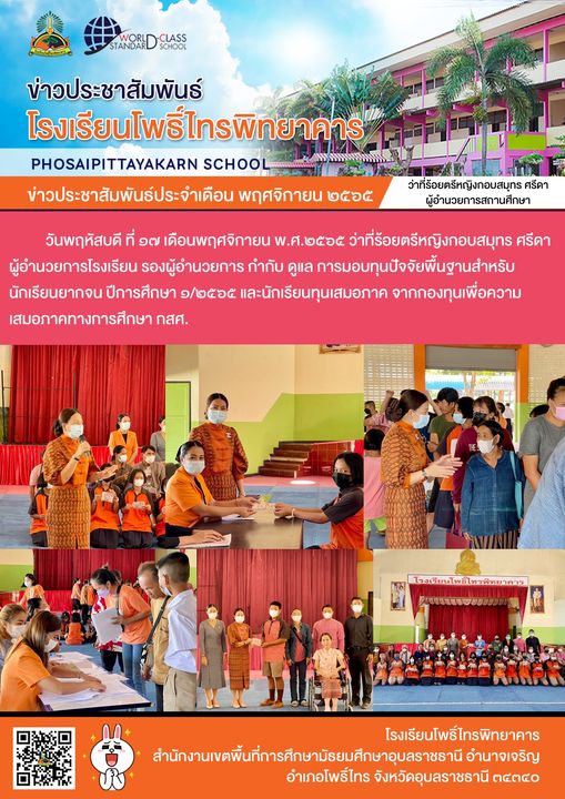 | วันพฤหัสบดี ที่ ๑๗ เดือนพฤศจิกายนพ.ศ.๒๕๖๕ ว่าที่ร้อยตรีหญิงกอบสมุทร ศรีดา ผู้อำนวยการโรงเรียน รองผู้อำนวยการ กำกับ ดูแล การมอบทุนปัจจัยพื้นฐานสำหรับนักเรียนยากจน ปีการศึกษา ๑/๒๕๖๕ และนักเรียนทุนเสมอภาค จากกองทุนเพื่อความเสมอภาคทางการศึกษา กสศ. |